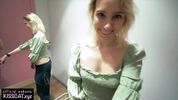 Русская блондинка отправилась в магазин Zara за новым бельем и прочими шмотками. С собой она взяла своего парня, иначе кто будет за все это платить? Она зовет его в примерочную, где примеряет лифчики на свои упругие сиськи. После этого она отсасывает большой член парня и дает в анал.