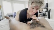 Белая пацанка с короткой стрижкой сосет огромный негритянский шланг.