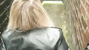 Блондинка с каре сосет член пикапера и ебется на улице у черной стены.