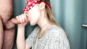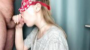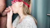 Блонди в красной маске заглатывает писюн и получает большую порцию спермы в рот.
