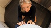 Стройная блондинка стоит на коленях и заглатывает хуй на кухне.