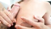 Чавкающая дрочка хуя между натуральных сисек стройной девушки в трусиках.