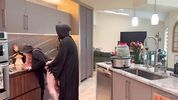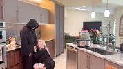 К блондинке пришел чувак в маске из фильма "Крик" и трахнул на кухне, на Хэллоуин.