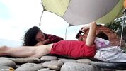 Симпатичная молодая туристка отдыхает на каменистом пляже со своим парнем. Парочку укрывает тент, поэтому никто не видит, что девчонка делает минет. После оральных ласк парень трахает подружку в писю и кончает внутрь. Он накрывает ее голую задницу полотенцем и тут же к их места отдыха подходит какой-то мужик. Едва не спалил чужой секс на природе!