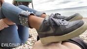 Парень отправился погулять на пляж со своей девушкой, но даже на природе они не могли отказаться от шалостей. Девчонка делает минет и дрочит большой член ногами в кроссовках. После орального секса партнер кончает подружке на обувь и она слизывает сперму с ботинок.