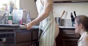 Девушки готовы на многое ради парней, которые согласны взять на себя часть обязанностей на кухне. Посмотрите, как обрадовалась эта девчуля, когда увидела, что парень моет посуду! Она тут же задрала повыше его фартук, села на корточки и начала вылизывать его зад снизу. Теперь парень будет частенько помогать ей по хозяйству.