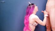 Девушка, похожая на диснеевскую принцессу, пообещала удовлетворить чувака по высшему разряду. Красотка с лиловыми волосами и в короткой белой юбке сосет член, стоя на коленях и глотает сперму. Она умудряется запихнуть член в глотку, и парень кончает ей глубоко в горло.