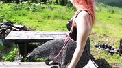 Долбит на природе фигуристую рыжую шалаву в юбке и чулках в сетку.