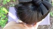 Рисковый чувак ебет мохнатку сисястой брюнетки в парке на природе.