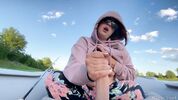Упитанная девушка в розовом худи мешает рыбаку удить рыбу, дрочит хуй и показывает сиськи в резиновой лодке.