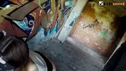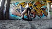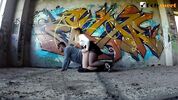 Русская графитчица в косухе пришла на заброшку, чтобы порисовать со своим приятелем. Она разрисовывает стены баллоном, а потом, задрав юбку и спустив колготки, трахается с парнем стоя. Внезапно чувак понимает, что тоже был бы не против получить хуй в анал, и девчонка трахает его страпоном. Спустить сперму парень решает на красивые сиськи.
