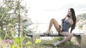 Красивая инстателка в платье мастурбирует на природе, сидя на лавочке.