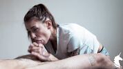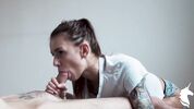 Модная девка с татуировкой классно делает минет и джеркинг ручками.