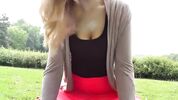 Симпатичная девушка в красной юбке отдыхала с другом на лужайке, возле большого озера, в парке. Но тут телке пришло в голову потрахаться. Чувак тоже был без тормозов и баба прикрыв юбкой сам процесс от окружающих, села пиздой на член, на скамейке. Через минуту чувак кончает в подругу в общественном парке, сперма течёт из пизды на траву. Результат будет через девять месяцев, но бабе сейчас очень весело.
