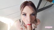 Сучка с красной помадой и в черных лосинах сосет хуй, получая камшот на лицо.