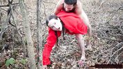 Крестьянка в красной рубахе села волосатой пиздой на лицо бородача в холодном лесу.