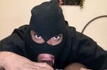 Крупная губастая негритянка в балаклаве сосет огромный черный шланг.