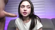 Симпатичная жопастая шатенка без трусов подвязала футболку повыше, чтобы не заляпать ее слюной и спермой. Она любит брать хуй глубоко в глотку и сейчас решила продемонстрировать свои таланты. Девушка делает горловой минет, стоя раком на диване и сияя голой аппетитной задницей. Когда парень кончает ей в рот, молодуха с удовольствием ее глотает.