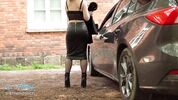 Незнакомка дрочит член через окно машины, а парень кончает на кожаную юбку.