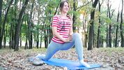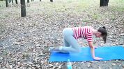 Русская баба обоссалась в штаны для йоги, во время тренировки в парке.