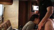 Сисястая брюнетка с заводит себя мастурбацией и теребит волосатую киску. Но парень быстро прерывает ее удовольствие, потому что хочет минет. Получив свое, он отходит, но ненадолго, потому что без него дамочка начинает мастурбировать. Мужичок заводится и решает тоже подрочить и спускает ей на живот.