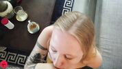 Утром она любит проснуться и выпить чашечку кофе со сливками. Вот только на этот раз сливок у нее не было, поэтому девушка придумала кое-что для себя. Она дрочит хуй и чувак кончает в ее напиток. Блондинка подносит ароматную чашку ко рту и пьет кофе со спермой.
