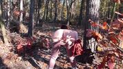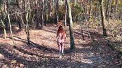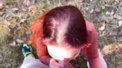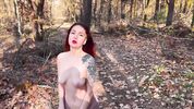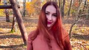 Русская девка с натуральными сиськами любит сосать хуй парня в сосновом лесу.