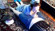 Русская деваха повалила мужика на ковер и сосет хуй, не давая пошевелиться.