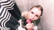 Мокрая русская студентка с татухами делает минет в душе и засасывает яйца. Она берет пенис за щеку, лижет головку и ласкает мощный ствол руками. Парень планировал кончить на ее красивые сисюльки, забитые татуировками, но потом передумал и кончает на лицо. Девчонка буквально умывается спермой.