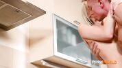 Худая блондинка пришла на кухню не для того, чтобы кофе пить. Раздевшись, она показала свое красивое тело в нижнем белье, затем достала стеклянный дилдо и принялась мастурбировать. Видя, как симпатичная крошка в гетрах кайфует от удовольствия, парень решает присоединиться и трахается с ней прямо на кухонном столе. В финале спускает сперму в рот.