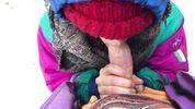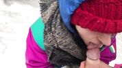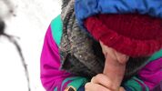На таком холоде даже мочиться стремно - струя замерзнет. Но этот чувак настолько суров, что достает хер на улице, на лыжном курорте и сует его в рот подруги. Тепло одетая деваха обсасывает болт прямо на снегу, и морозный воздух холодит мокрый от ее слюны толстый ствол. Чувак кончает девушке в рот и спешит убрать болт в штаны.