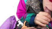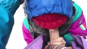 Тепло одетая девушка сосет большой хуй зимой на снегу на лыжном курорте.