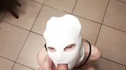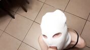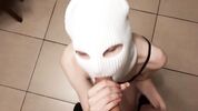 Тощая русская девка в белой балаклаве присосалась к хую на кухне.