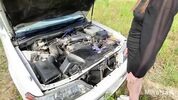 Худосочная русская девчонка застряла на пустыре, она не рассчитала с бензином и ей нужно срочно заправить бензобак. Тут подошел незнакомец и предложил помощь. Отказывать глупо, и девчонка приняла предложение. Вот только по итогу хлопец заправил ее пизду, а не бак. Русские MikeNasi ебутся на природе, стоя возле машины, после чего девчонка натягивает трусики на писю со спермой внутри.