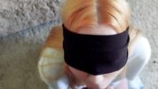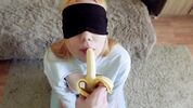 Засунул член в рот сводной сестры вместо банана: минет с завязанными глазами, сперма на лице.
