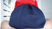 Стройная властная блондинка в синей юбке и сапогах вошла в комнату, чтобы трахнуть парня. Она не спрашивает, хочет ли он секса, просто садится на его большой член и трахает сверху в позе обратной наездницы. Она ритмично двигает красивой попкой и получает кремпай в киску. Вставая, зрелка вытирается между ног и натягивает стринги.